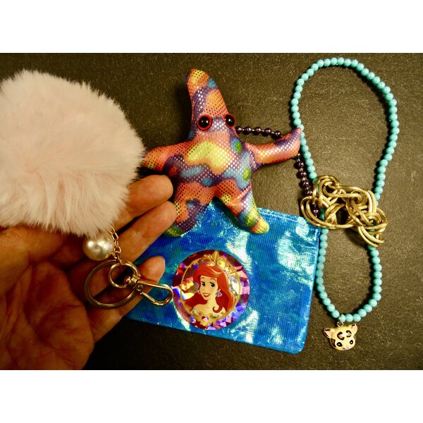 alles vom Foto. Der wuschelige Taschenbaumler mit Perle und Karabiner-Haken hat 9,90 gekostet.