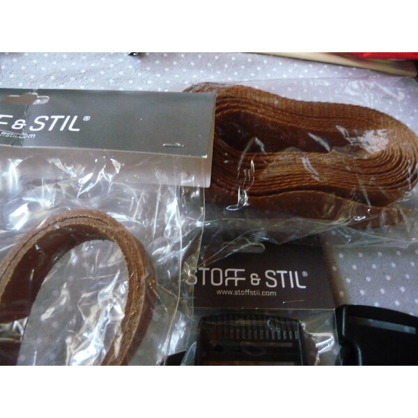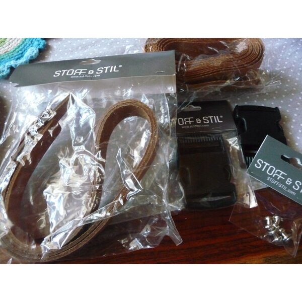 Zubehör für Rucksack oder Tasche: 2 Henkel aus Leder, Gurtband, 2 Steckschnallen, Metallfüße für den Taschenboden