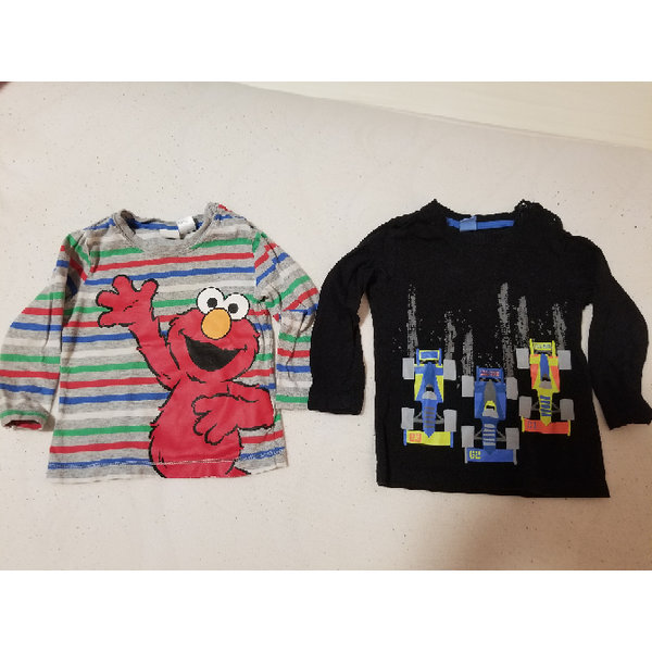 Das Shirt mit dem Elmo ist vom Waschen schon leicht verformt und der Aufdruck löst sich ganz unten schon etwas ab. Das schwarze Shirt ist fast neuwertig.