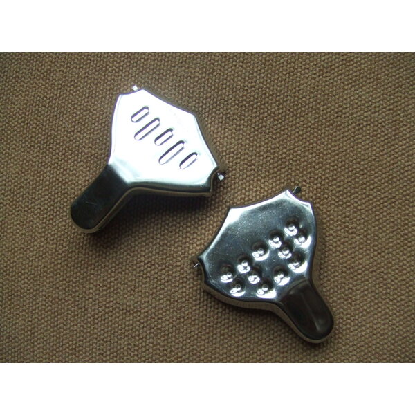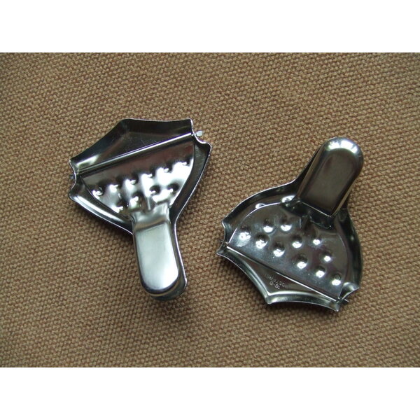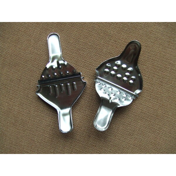 Zwei kleine Pressen aus Metall für Zitronenscheiben. Die beiden Modelle sind leicht unterschiedlich, möglicherweise von unterschiedlichen Herstellern.