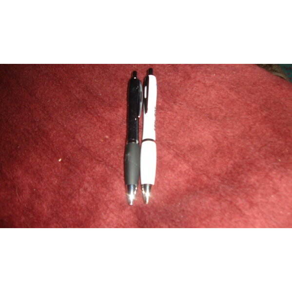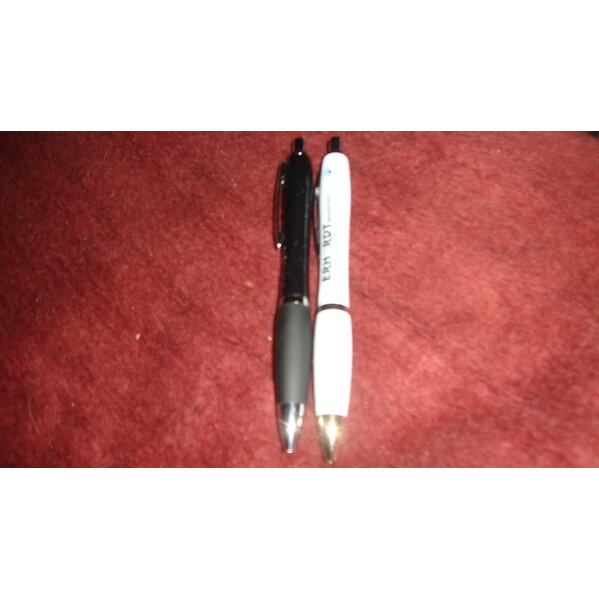 Zwei neue Kugelschreiber im Set, schwarz und weiß, jeweils mit blauer Mine, der weiße Kuli ist mit Werbeaufdruck