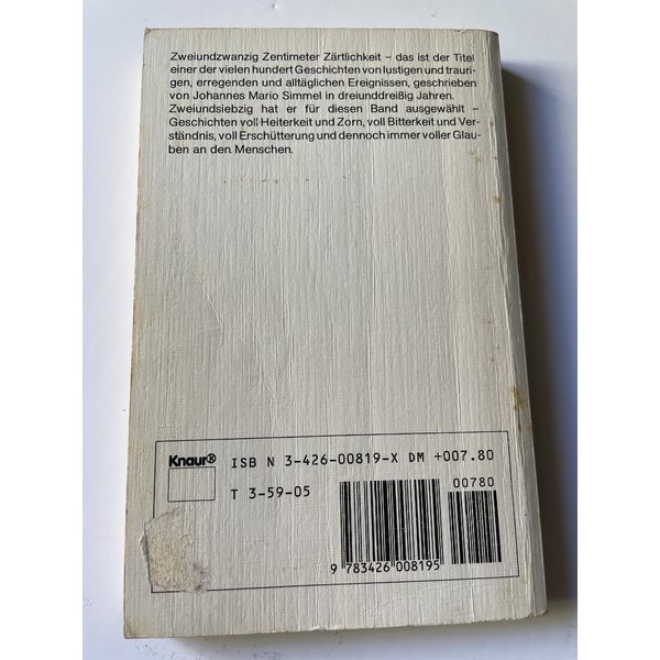 Zweiundzwanzig Zentimeter Zärtlichkeit - das ist der Titel einer der vielen hundert Geschichten von lustigen und traurigen, erregenden und alltäglichen Dingen, geschrieben von Johannes Mario Simmel in mehr als dreißig Jahren.Zweiundsiebzig wurden für diesen Band ausgewählt - Geschichten voll Heiterkeit und Zorn, voll Bitterkeit und Verständnis, voll Erschütterung und dennoch immer voller Glauben an den Menschen.