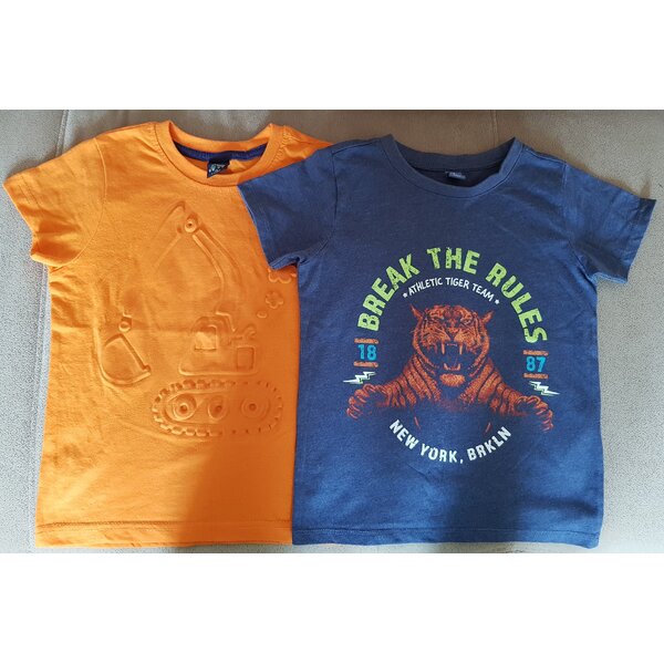 2 tolle Shirts in Gr. 116, das Orange ist vom Stoff her etwas fusselig, meliert sozusagen, da es aber überall so ist, ist es wohl normal, das Blaue ist auch einwandfrei, Maße: 35-36cm unter den Achseln, 44 und 46cm lang