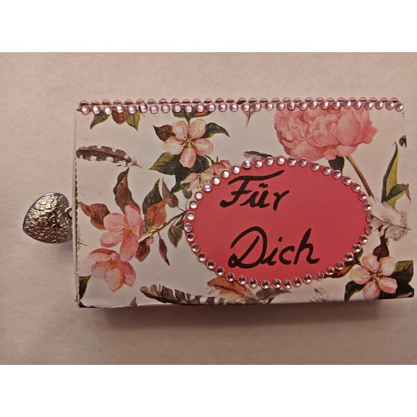 Neu hergestellt aus recycelten Streichholzschachteln mit Dekopapier, Perlen..., innen mit Filz ausgelegt.