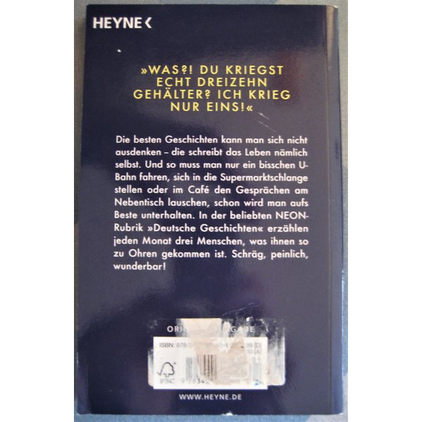 SPIEGEL-Bestseller-Erfolg in Serie: das neue NEON-BuchDie besten Geschichten kann man sich nicht ausdenken – die schreibt das Leben nämlich selbst. Und so muss man nur ein bisschen UBahn fahren, sich in die Supermarktschlange stellen oder im Café den Gesprächen am Nebentisch lauschen, schon wird man aufs Beste unterhalten. In der beliebten NEON-Rubrik »Deutsche Geschichten« erzählen jeden Monat drei Menschen, was ihnen so zu Ohren gekommen ist. Schräg, peinlich, wunderbar!