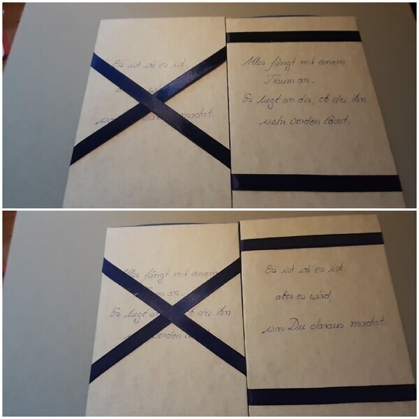 Jede Mappe ist ein Einzelstück und eine genaue Anleitung liegt bei. Bitte Beachten alles ist Handmade individuell gearbeitet und nicht mit der Maschine gefertigt. In meinem Regal gibt es verschiedene Größen ud Ausfertigungen.