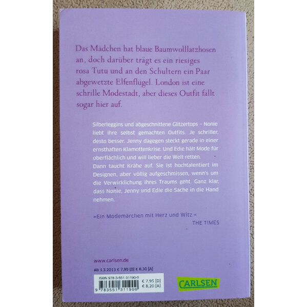 Silberne Leggins und abgeschnittene Glitzertops - Nonie liebt ihre selbst gemachten Outfits. Je schriller, desto besser. Jenny dagegen steckt gerade in einer Klamottenkrise. Und Edie will sowieso lieber die Welt retten. Dann taucht Krähe auf. Sie ist hochtalentiert im Designen, weniger talentiert in Rechtschreibung - und völlig aufgeschmissen, was ihren großen Traum betrifft. Ganz klar, dass Nonie, Jenny und Edie mit ihrer neuen Freundin durch Dick und Dünn gehen.