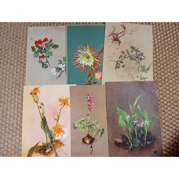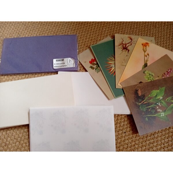 15 Umschläge im Format 17,5 x 10 cm ( 7 x creme, 8 x mit Baum auf der Rückseite), 9 lilafarbene Umschläge im Format 19 x10 cm, 6 Umschläge im Format 17 x 9,5 cm ( innen mit Blumenprint), 6 Postkarten mit Arzneipfanzenmotiven