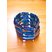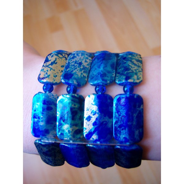 Handgearbeitetes Armband aus blau/gold marmorierten Acryl- und runden Glascrackleperlen. Dehnbar dank Gummizug. Die Breite beträgt ca. 4,3 cm.
