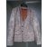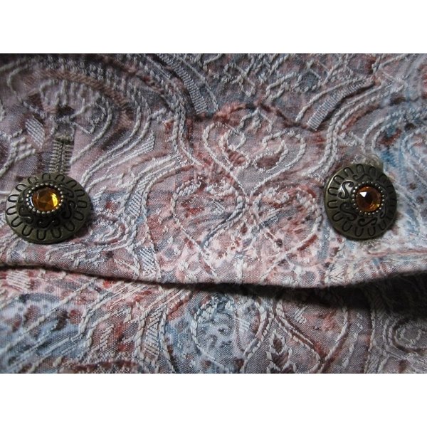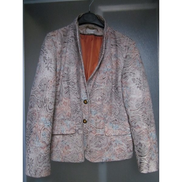 Der Blazer hat zwei Klappentaschen (eine ungeöffnet), die Grundfarbe ist beige, etwas orange, etwas türkis, etwas braun; strukturierter Stoff - schwer zu beschreiben, am Besten auf dem 3. Photo zu erkennen