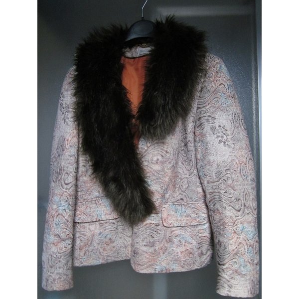 macht was her: ein super Blazer - der Hammer ist der Kunstfellkragen, der ihn wirklich schick macht, der aber für dezentere Auftritte auch abgeknöpft werden kann. Dann bleiben immer noch die zwei edlen Knöpfe mit orangener, funkelnder Mitte.