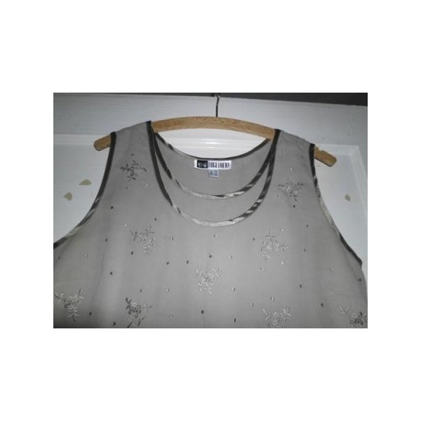 2 Lagen übereinander zusammen genäht... Ober- und Unterteil aus gleichem durchsichtigen Material, dadurch wird das Top blickdicht... obere Lage allover mit Blüten bestickt... Rundhalsausschnitt und Armausschnitte mit glänzendem Satin abgesetzt...