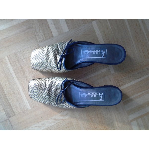 Diese Qualitätsschuhe sind made in Italy. Sie haben vorne eine Kappe aus geflochtenen Streifen wahrscheinlich aus Leder aber in Strohoptik. Die Form ist eher eckig und der kleine Blockabsatz ca. 4cm hoch. Die Schuhe sind hinten offen. Die Umrahmung der Sohle und des Vorderteils ist dunkelblau ebenso die Masche. Die Schuhe haben eine Ledersohle.