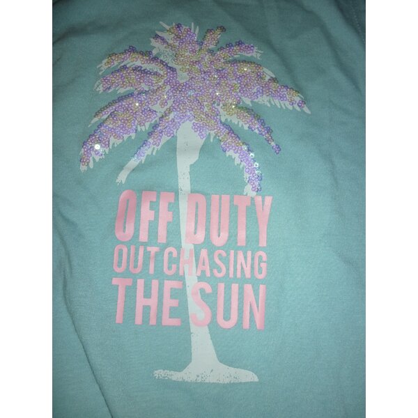 Biete hier ein hellblaues/türkises Top mit Pailletten, Palmendruck, Knoten vorn in der Mitte, etwas kürzer geschnitten, Polyester mit Viskose, von H&M, Größe 146/152, leichtes Pilling