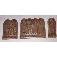 Wohl aus Resin angefertigte Replik rines mittelalterlichen Reusealtars ider einer Darstellung in einer mittelalterlichen Kirche. Alle dreicTeile geben ... mehr