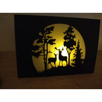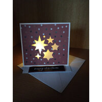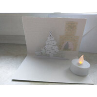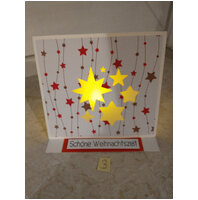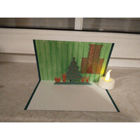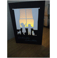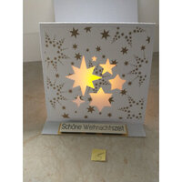 Aufstellkarte mit dem Motiv eines" Nikolaus/Weihnachstmannes".Wenn ein elektrisches Teelicht dahinter gestellt wird leuchtet das Motiv.Mit einfachem ... mehr
