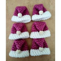 Sechs hübsche kleine, selbst gehäkelte Mützchen mit einer kleinen Holzkugel als Bommel.