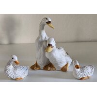 Drei niedliche Gänsefiguren aus Keramik. Das Paar mit den größeren Gänsen bildet eine Figur, die ca. 12 cm hoch ist. Die zwei kleinen sitzenden ... mehr