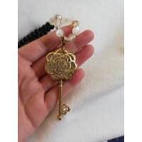 etwas länger; mit gröberen goldfarbenen Kettengliedern, wird zum Verschließen offen eingehakt