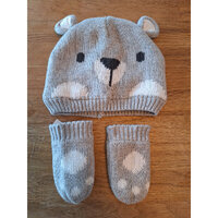 Schönes Set aus Strickmütze und Handschuhen in Größe 74cm (6-12 Monaten). Die Mütze in Grau zeigt ein Bärengesicht mit Ohren, die Handschuhe das ... mehr