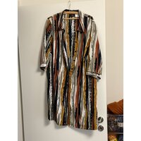 Leichte Long-Bluse mit Längsstreifen in Brauntönen, schwarz und weiß.
