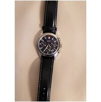 Diese Herrenarmbanduhr von GFF ist analog, mit neuer Batterie, Chronograph in Schwarz Silber und hat ein Lederarmband.