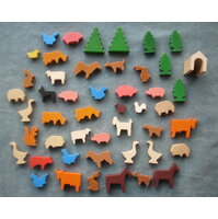 Kleine Holztiere, Bäume und eine Hundehütte. ... mehr