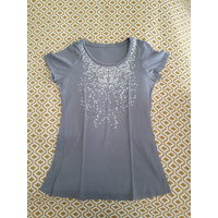 Graues T-Shirt mit Pailletten auf der Vorderseite.