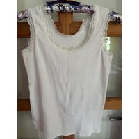 Weißes geripptes Top mit Spitze am Ausschnitt und an den Armausschnitten. Länge ca. 44 cm, gemessen vom Ausschnitt vorne. Weite ca. 44 cm, gemessen ... mehr