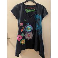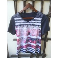 Rot, weiß, blau Hintergrunddruck. Unter dem Ausschnitt silberfarbene Steinchen. Angenehm zu tragen. T-Shirt ist leicht durchsichtig.