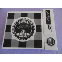 3 neue Gummi-Stempel - 1x Motiv Kronkorken mit Spruch und Karo-Hintergrund, 1x Kronkorken klein mit SWEET und 1 Hand mit ausgetrecktem Zeigefinger ... mehr