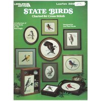 Hier sind Kreuzstich-Arbeiten von vielen verschiedenen Vögeln zu sehen. Die Stickmuster und Farbcodes sind ebenfalls farbig abgebildet.