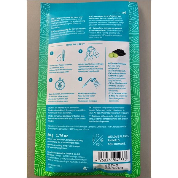 Hochkonzentrierte Ayurvedische Haarmaske aus 100 % purer Amla-Aktivkohle. Befreit Haar und Kopfhaut effektiv von Silikon- und Stylingrückständen, optimale Vorbereitung auf Pflanzenhaarfarben.