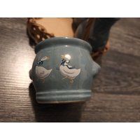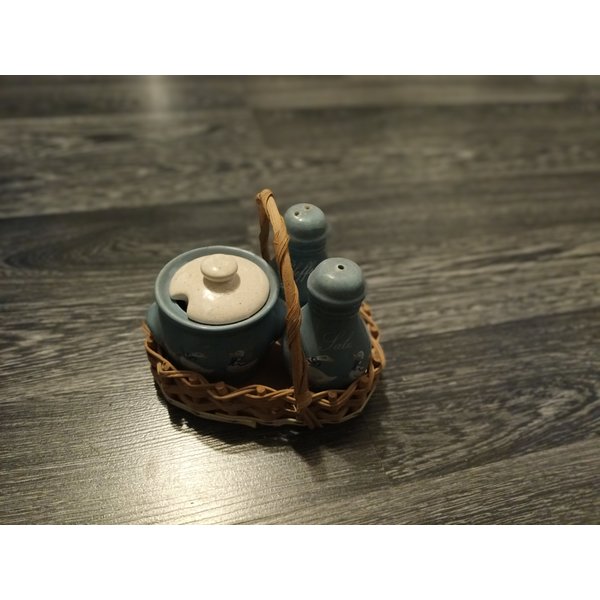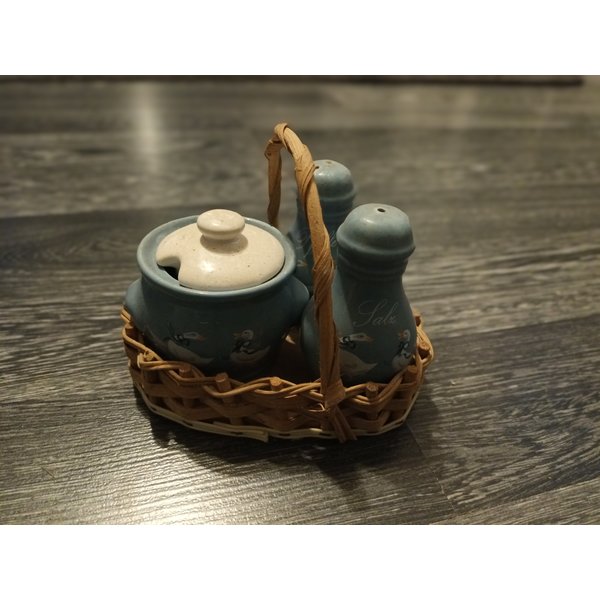 Biete hier ein niedliches Körbchen mit einem Salz- und Pfefferstreuer und einem Senftopf (z.B.). Im letzteren kann man einen Löffel einstecken- gibt es mit dazu. Das Muster der Menage ist hellblau mit Gänsen.Die Salz- und Pfefferstreuer sind 9 cm hoch, das andere Gefäß 6 cm.