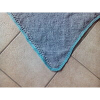 Kleines Dreiecktuch für einen warmen Ausschnitt, glatt rechts gestrickt und mit türkisem Garn umhäkelt. Das Tuch ist 80 cm breit und 47 cm hoch.