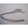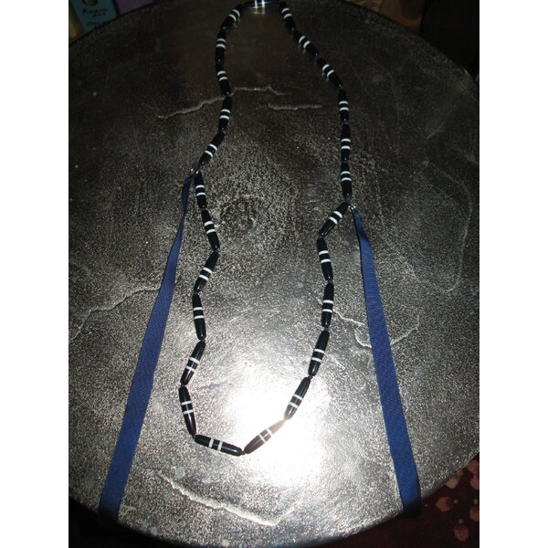 Lange (4cm) schwarze Kunststoffperlen mit weißen Streifen - an 2 Seiten sind mittels kleinem Ring marineblaue Bänder, die locker herunter hängen sollen