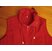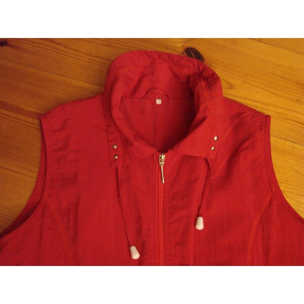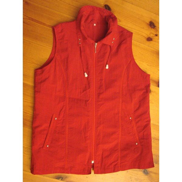 Weste in mohnrot, etwas dunkler als auf den Fotos. Mit leichtem Futter. Kragen mit Zugband. 2 schräge Taschen vorn und eine Brusttasche innen. Beidseitig kleine Reißverschlüsse am unteren Rand.