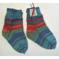Handgestrickte extra kleine Babysocken aus Sockenwolle von Woll Butt "Kids" in blau, rot und grün. Feines Bündchen am Beinabschluss