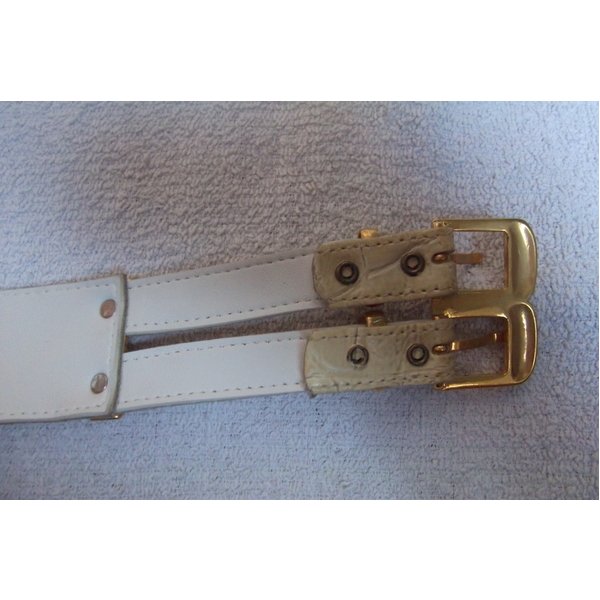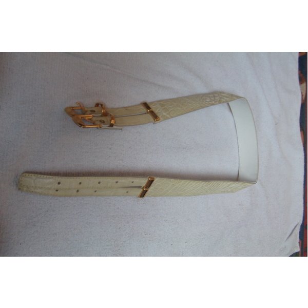 helles Lackleder mit Krokoprägung, Gürtel mit Doppelschnalle in goldfarben. Gürtel-Länge mit Schnallen 95 cm, für Taillenweite 80 cm - 90 cm, Gürtelbreite 4 cm, ganz in weißem Leder unterlegt