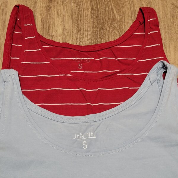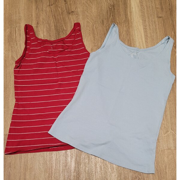 2 Stück neuwertige Achseltops von Janina in der Gr. S (34/36), in rot weiß gestreift u. hellblau, stretchig - Material: 95% Baumwolle & 5% Elasthan