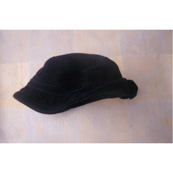 schicker Hut / Mütze aus Kindermodengeschäft. Schön verarbeitet, hinten ist der "Kragen" umgeschlagen und mit einer Schleife befestigt. Schwarzer samtartiger Stoff aus 40% Polyester, 40% Seide, 20% Baumwolle. Innenfutter 100% BW.