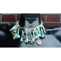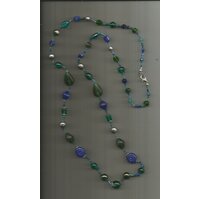 Glasperlenkette mit grünen, blauen, metallisch glänzenden Perlen in verschiedenen Farben, Formen und Größen sowie einigen Tibetsilberteilen