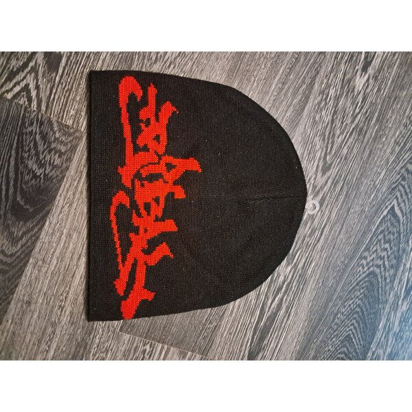 Biete hier eine schwarze Strickmütze mit einer roten Aufschrift, die ich nicht deuten kann. Sie ist eher klein und auch nicht gut dehnbar.