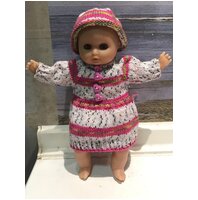 Handgestrickte Kleidung für Puppe 21 cm, aus Sockenwolle von Woll Butt "Söckli Fruits" in weiß, pink und regenbogenfarben. Hinten ... mehr