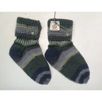 Handgestrickte Babysocken aus Sockenwolle von Woll Butt "Milos" in grün, blau und grau. Offenes Bündchen, fixiert mit einem kleinen Knopf am ... mehr