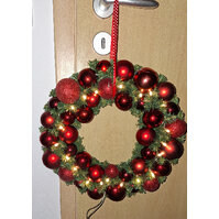 Beleuchteter Türkranz künstlich mit roten Kugeln. LED Beleuchtung. ... mehr