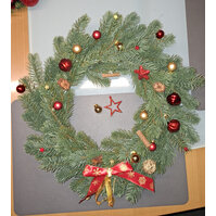 Kranz aus biegsamen künstlichen Tannenzweigen, mit Dekoelementen beklebt, (2 sind abgefallen, kann man mit der Heißklebepistole wieder anbringen) ... mehr