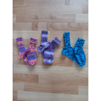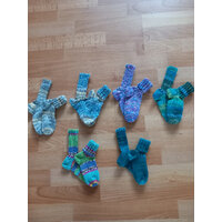 Handgestrickte extra kleine Babysocken aus Sockenwolle von Woll Butt "Freeport" in braun, grün, orange, rot, blau und weiß. Feines Bündchen am ... mehr