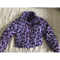 Kurze warme Jacke aus glatten Lila Stoff mit schwarzem Leo-Muster aus Samt. Sehr gemütliche Jacke und sie hält sehr warm. Taschen an der Seite und ... mehr