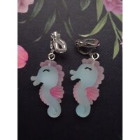 Farbige und plastische Seepferdchen-Ohrclips. Zum Tragen sind keine Ohrlöcher erforderlich, der Schmuck wird einfach ans Ohrläppchen ... mehr